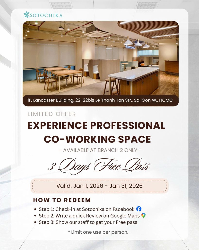 Now is the perfect time to experience Sotochika Professional Co-Working Space β€” on us.